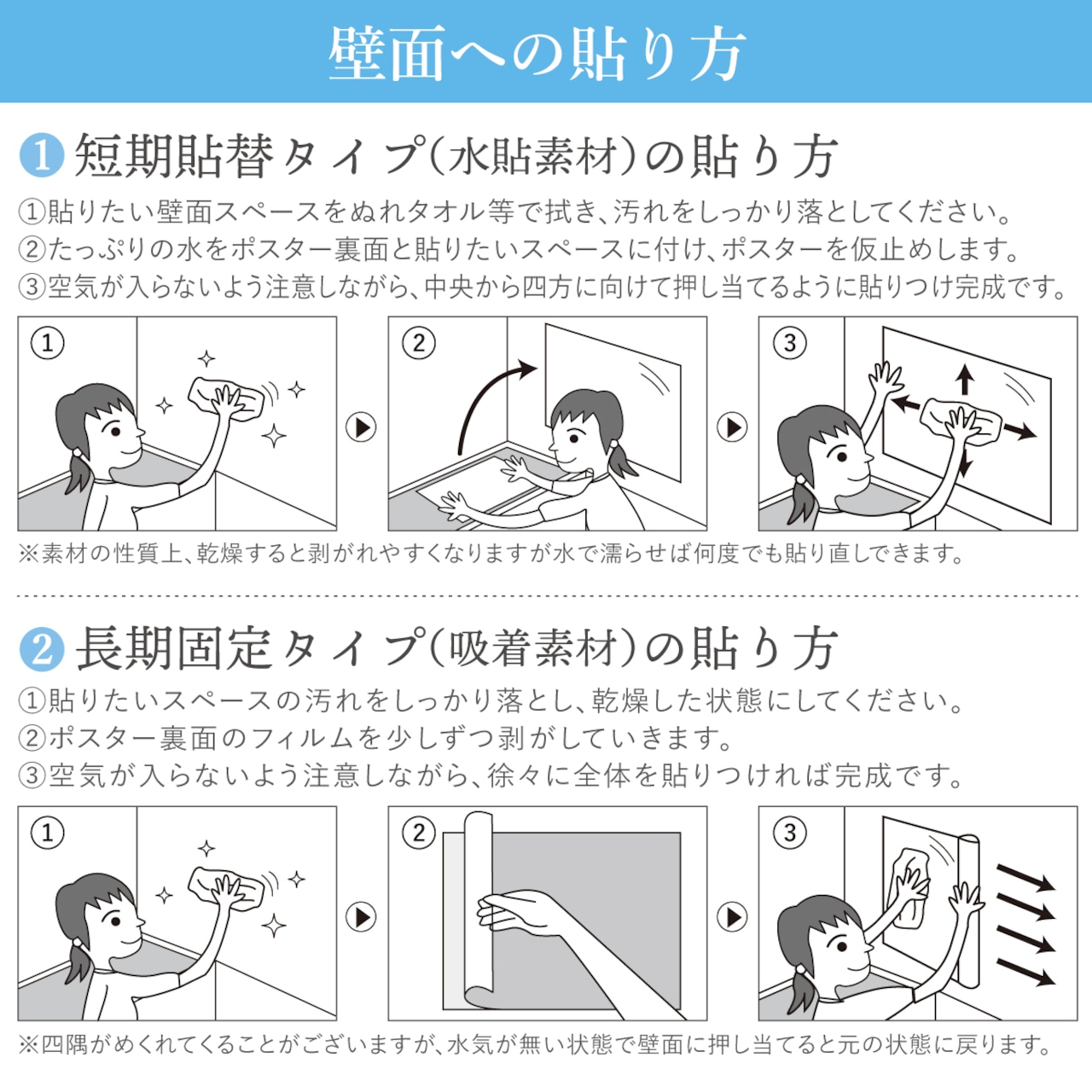 ①壁面をぬれタオル等で拭き、汚れをしっかり落としてください。②たっぷりの水をポスター裏面と壁面に付け、仮止めします。③空気が入らないよう注意しながら、中央から四方に向けて押し当てるように貼りつけます。
