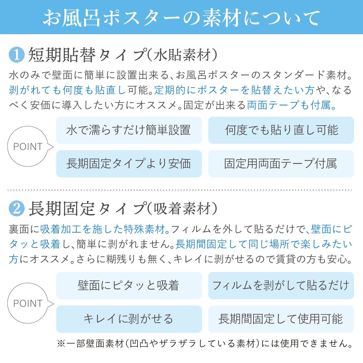 水のみで壁面に簡単に設置出来る、お風呂ポスターのスタンダード素材。剥がれても何度も貼直し可能。定期的にポスターを貼替えたい方や、なるべく安価に導入したい方にオススメ。